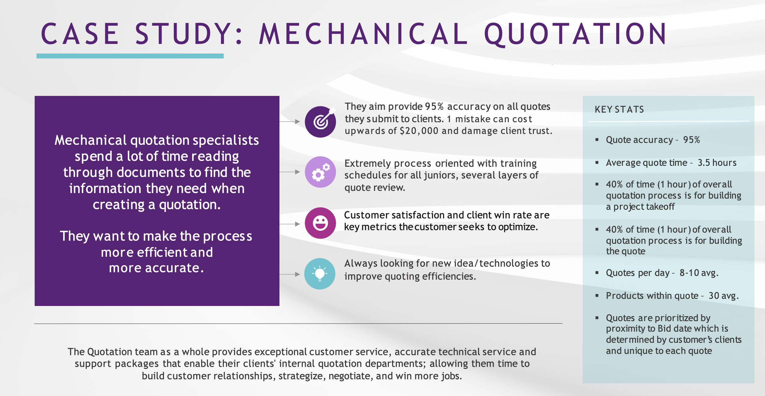 The core users of Orbiseed’s construction product are Mechanical Quotation Specialists (MQS). They are highly paid knowledge workers that inspect Mechanical, Plumbing, Electrical, and Fire Protection drawings, review project specifications, and addenda to generate quotations. MQSs are inundated with so much data & noise that it’s increasingly difficult to find important information and a lot of human effort is required to extract key information from very large PDF files that often exceed 1,000 pages. On average, it takes 3.5 hours for an MQS to produce 1 quotation making it very difficult to scale quotation generation in an industry where the first quote to market often wins the business.